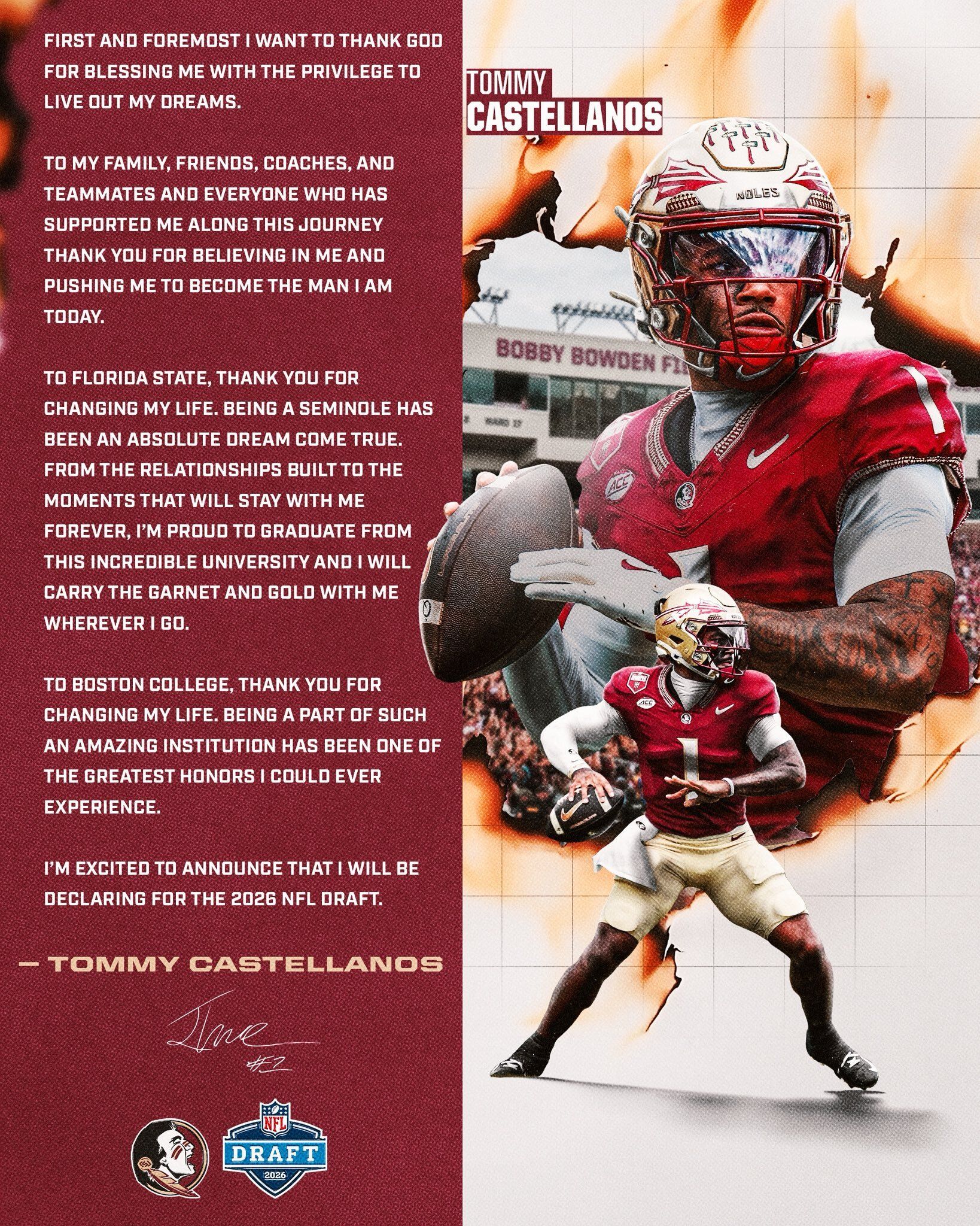 “To Florida State, thank you for changing my life. Being a Seminole has been an absolute dream come true,” Castellanos posted. “From the relationships built to the moments that will stay with me forever, I’m proud to graduate from this incredible university and I will carry the garnet and gold with me wherever I go.”