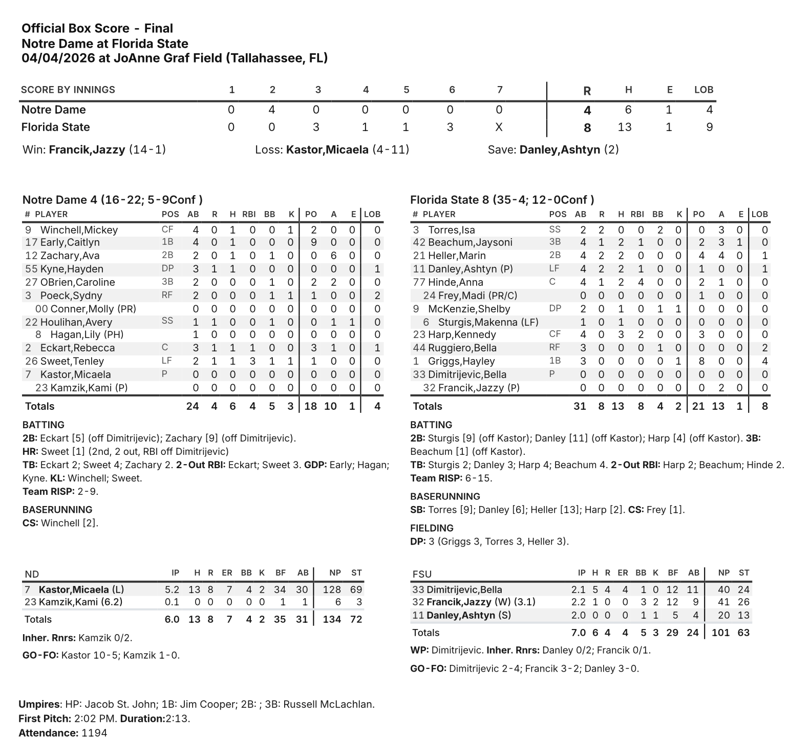 Friday was a 10-0 run-rule victory for FSU where the bats came alive and the Irish simply had no answer. Torres and Kennedy Harp blasted home runs, while Danley had two hits and three RBI. This was an easy victory for the Seminoles as they headed into Saturday with a sweep in their sights.